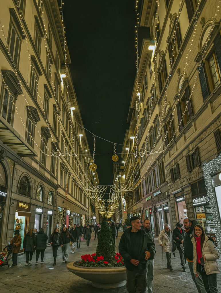 At the end of the Piazza di Santa Trinita, turn east along Via Porta Rossa. Via Porta Rossa is home to one of Florence’s most dazzling Christmas light displays. This long stretch or medival facades is draped with golden string lights that loop between the buildings in graceful arcs, the street becomes a glowing tunnel of warmth and wonder. Radiant red-and-white Florentine fleur-de-lis are suspended proudly, a festive nod to the city’s centuries-old symbol. The cobblestones shimmer underfoot, especially after a light rain, and oversized red ornaments float above like baubles plucked from a giant’s tree. Shops glow from within, spilling light and colour onto the slick pavement, while garland-wrapped lampposts add a touch of old-world charm.