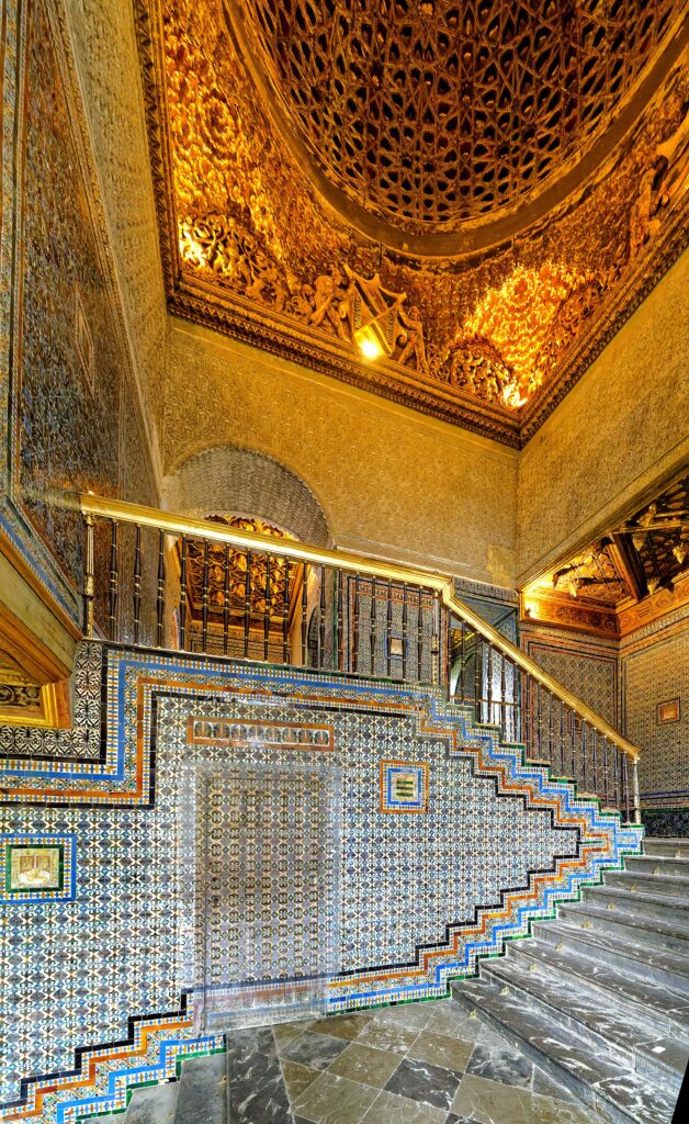 This evolving tilework is especially striking along the palace’s grand staircase, the first monumental staircase in Seville. Designed in the 1530s as a symbol of Renaissance grandeur, it replaced a modest medieval spiral stair and became a dramatic transition between the public courtyard and the noble upper chambers. Lavishly decorated with tiles and crowned by an intricate dome reminiscent of the Hall of Ambassadors in the Alcázar, the staircase exemplifies the palace’s embrace of both Mudejar ornamentation and Renaissance ceremony.