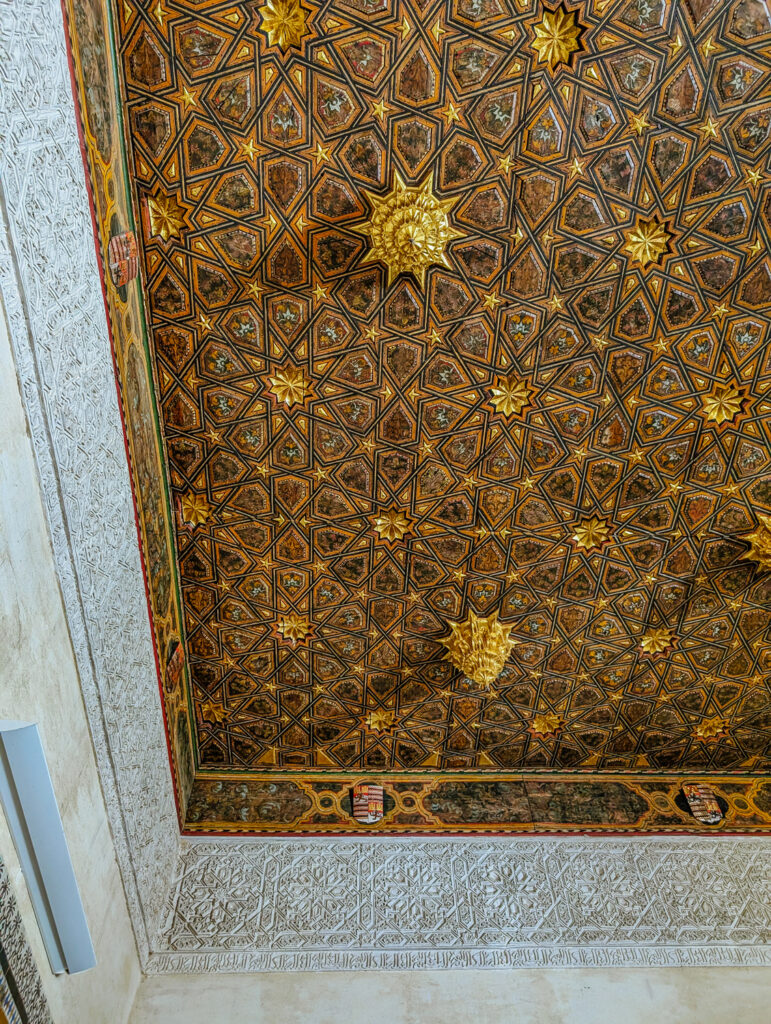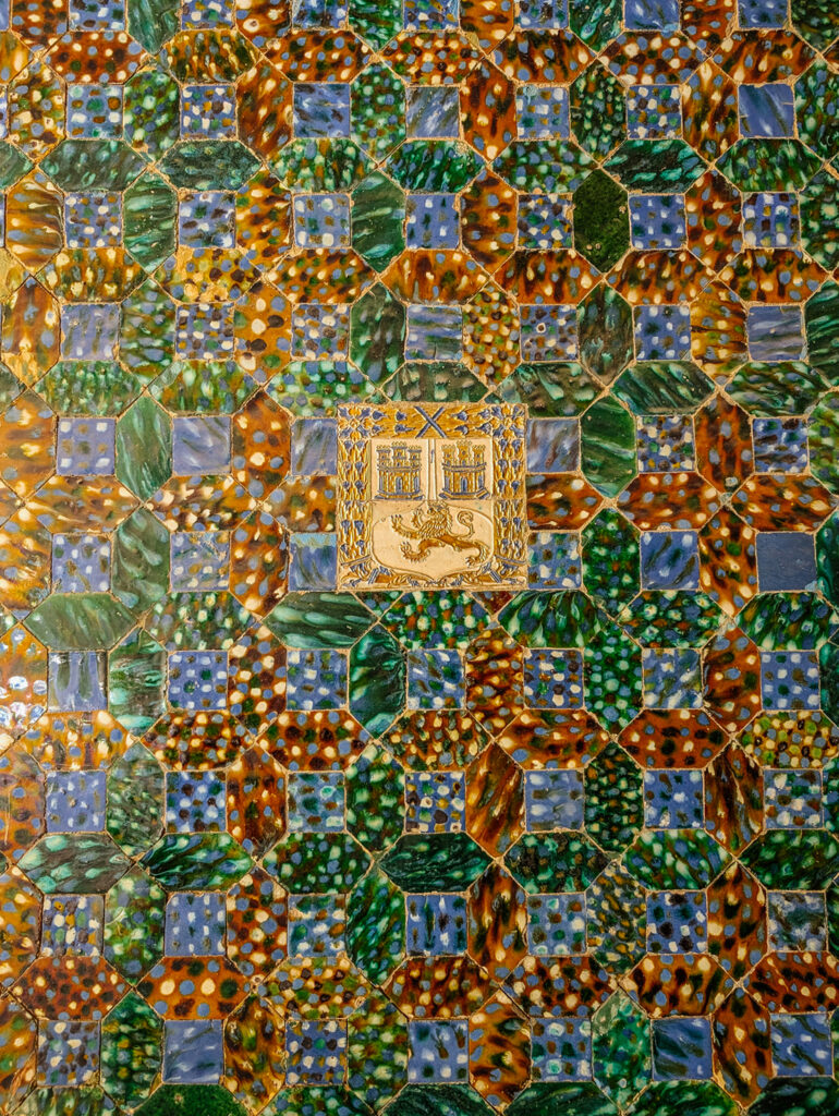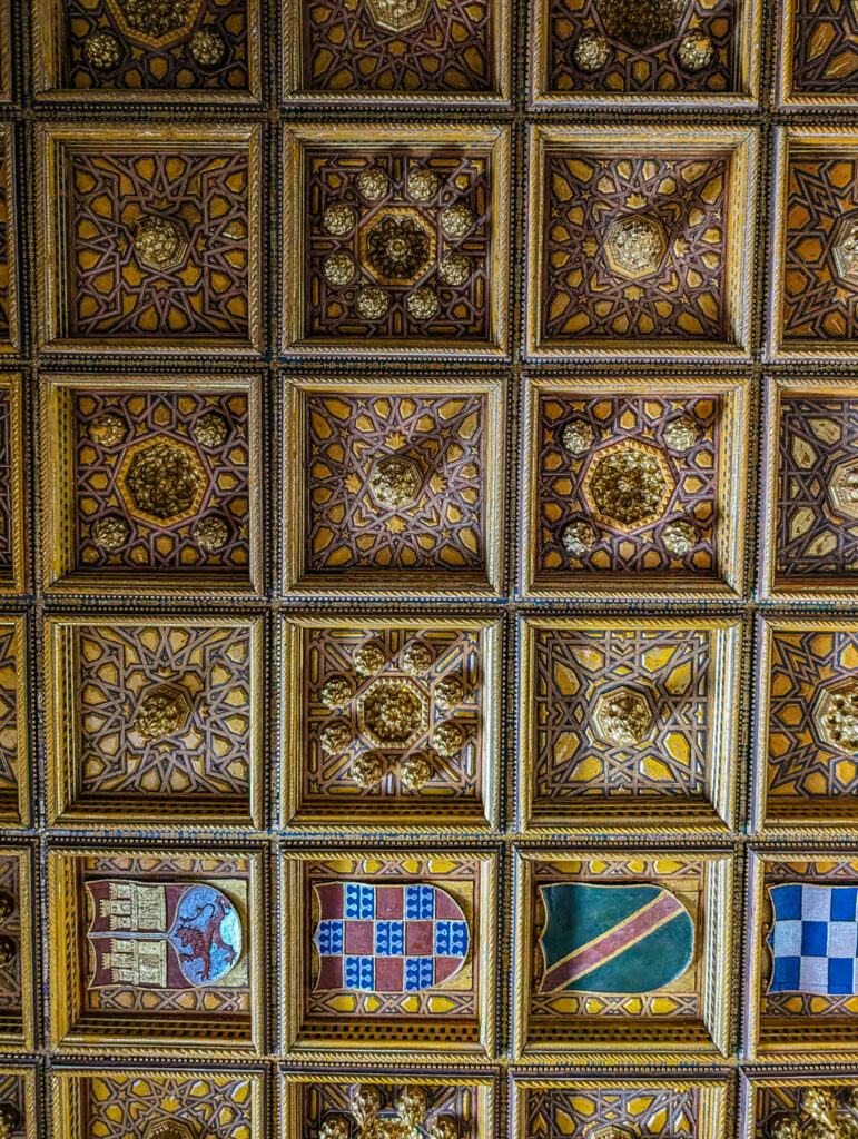 Equally impressive is the coffered ceiling, also by Andrés de Juara, composed of five rows of square panels inspired by Classical Antiquity. This design echoes the architectural logic of the Pantheon’s dome in Rome, a model Don Fadrique likely encountered during his pilgrimage through Italy. Yet, despite its classical structure, the ceiling is adorned with distinctly mudéjar elements: interwoven lacería patterns and mocárabes (stalactite-style prisms), revealing a deep connection to local craftsmanship and a continued admiration for the ornamental splendour of the Alcázar.