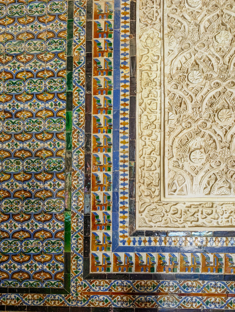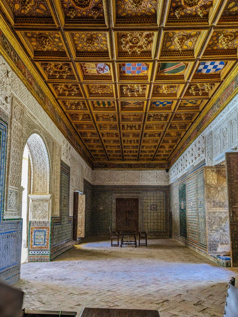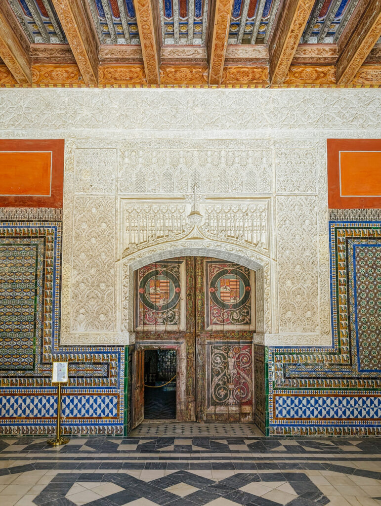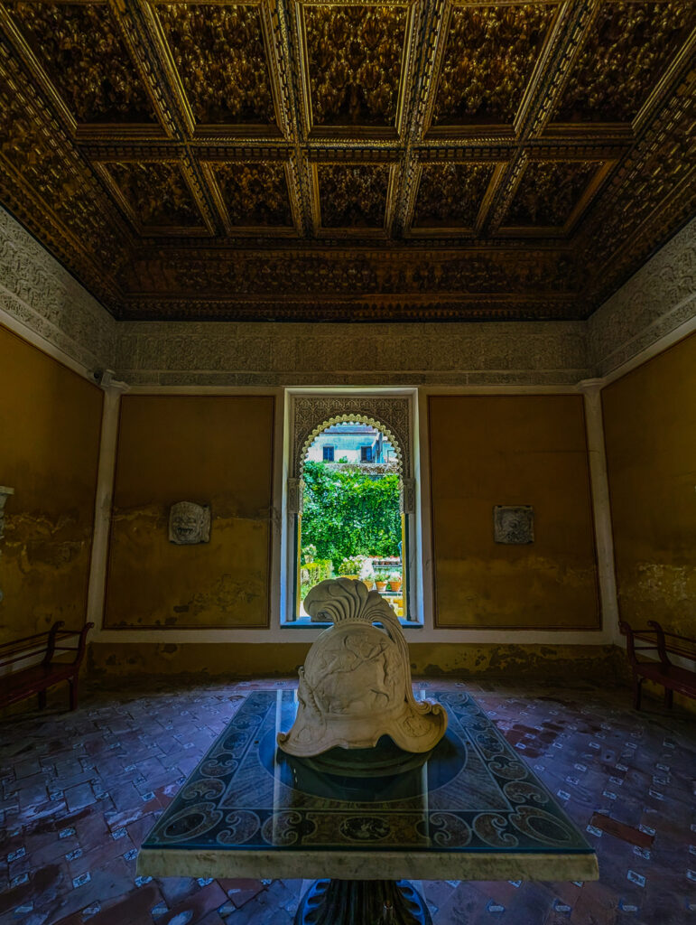 The room’s decorative richness is remarkable. Along the lower walls, bold tilework produced using the innovative cuenca (basin) technique creates a striking skirting. The spaces between the tilework and ceiling are filled with delicate stucco reliefs, blending Arabic inscriptions, vegetal motifs (atauriques), and miniature architectural forms. Two mullioned windows flank the entrance, flooding the room with light and highlighting the blend of Islamic and Renaissance influences that define Casa de Pilatos.