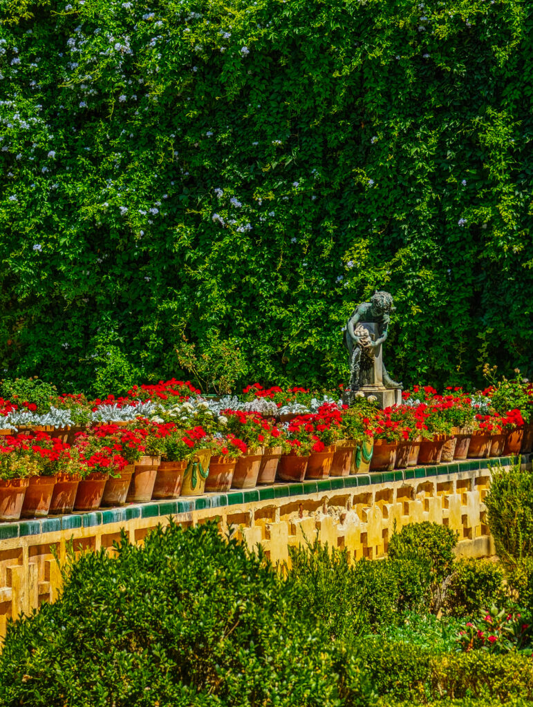 At the garden’s heart lies a star-shaped tiled pond, an early 20th-century Neo-Mudéjar installation, whose fountain is topped by Mariano Benlliure’s 1900 bronze of a youthful Bacchus. Nearby, a Renaissance‐style Eros holding a bird offers a playful nod to classical antiquity.
