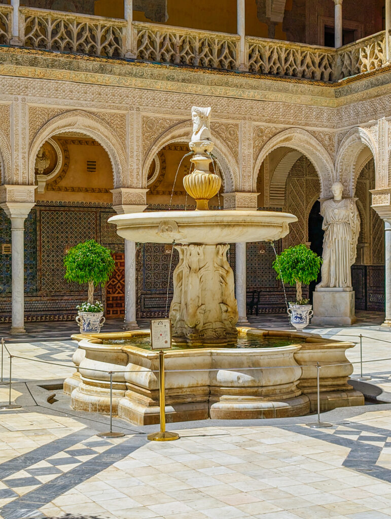 The fountain in the main patio is a statement piece of Renaissance elegance set against a Mudéjar backdrop. Carved in 1529 by the Genoese workshop of Aprile da Carona, it’s sculpted from polished Carrara marble and rises more than four meters high. Its design consists of two basins, the lower, square-within-a-circle “cup,” and above it a circular “sea”, linked by a central pedestal supported on four downward-gazing dolphins. Atop this rises a striking bust of Janus, the two-faced Roman god of transitions, whose dual profiles symbolize the passage between past and future.