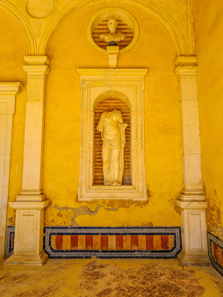 From the back of this room, you can exit out into the pièce de résistance of the Casa de Pilatos; the Large Garden. Formerly an orchard, this space was reimagined in the late 1500s as an elegant archaeological garden. In Renaissance Seville, gardens were far more than greenery; they were living museums. The first Duke of Alcalá, who, after serving as Viceroy of Naples, returned with a collector’s eye and a passion for classical sculpture. Inspired by Italian villa gardens, he tasked engineer Benvenuto Tortello with transforming the old orchard into an “archaeological” landscape.