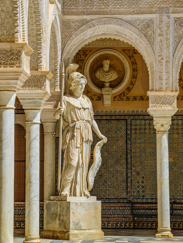 In the northwest corner of the main courtyard, your eye will quickly be drawn to the Medici-style statue of Athena, the crown jewel of Per Afán de Ribera’s sculpture collection. This impressive figure is a 2nd-century Roman copy of a Greek original, thought to date back to around 435 BC. The term “Medici” refers to statues that mirror the pose of the colossal nine-meter bronze Athena created by the legendary sculptor Phidias for the Acropolis, which was sadly lost when it was destroyed in Constantinople in 1203. What makes this version at Casa de Pilatos truly extraordinary is that it’s the only known Medici-type Athena that still retains its original Roman head.
