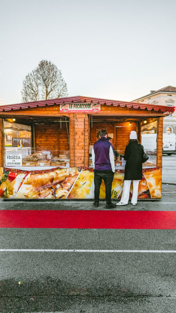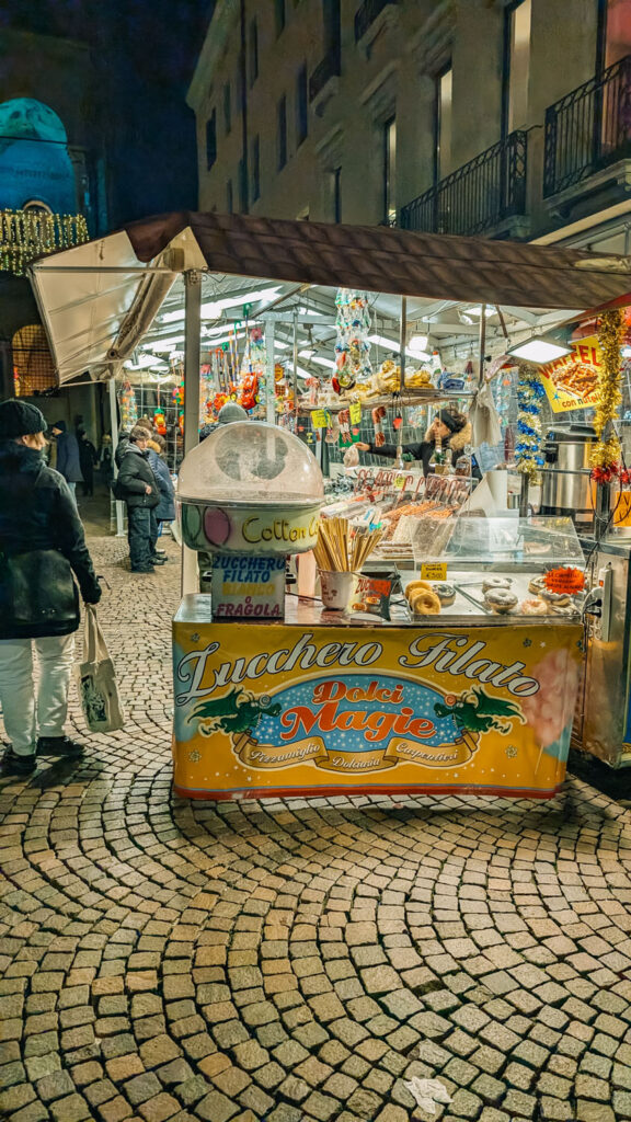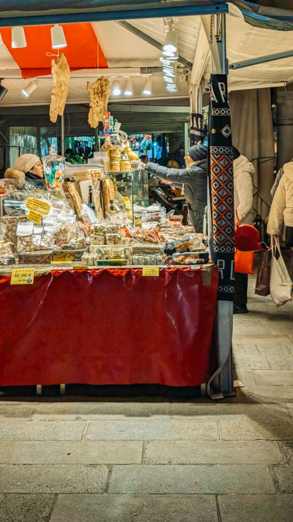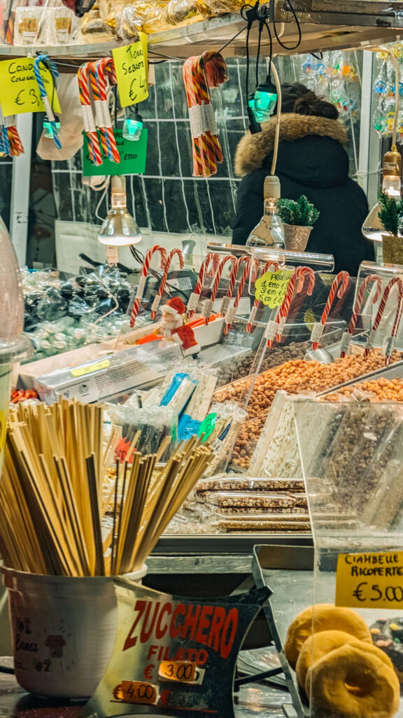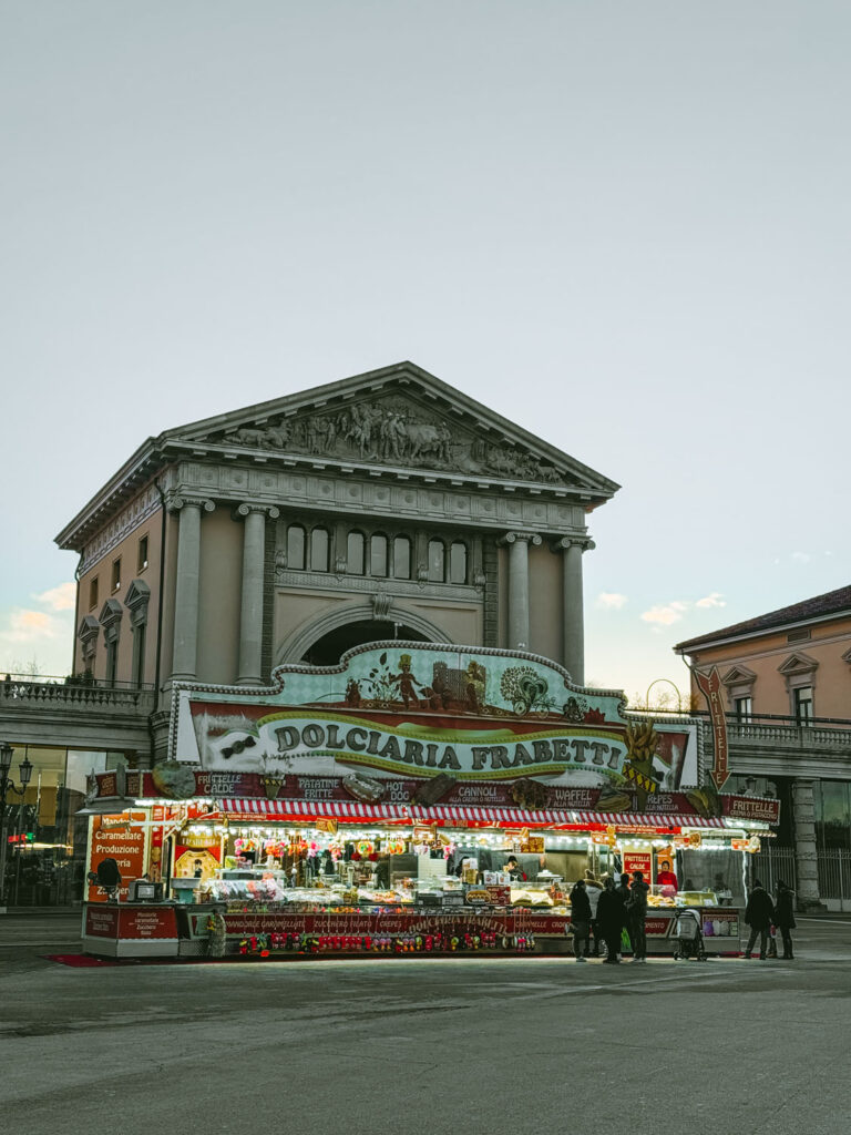 Around the edge of the ice rink at Prato della Valle, you’ll find a small cluster of wooden market booths that add to the festive atmosphere. These stalls carry a mix of seasonal snacks and warm drinks you can enjoy between laps on the ice or while watching from the sidelines.