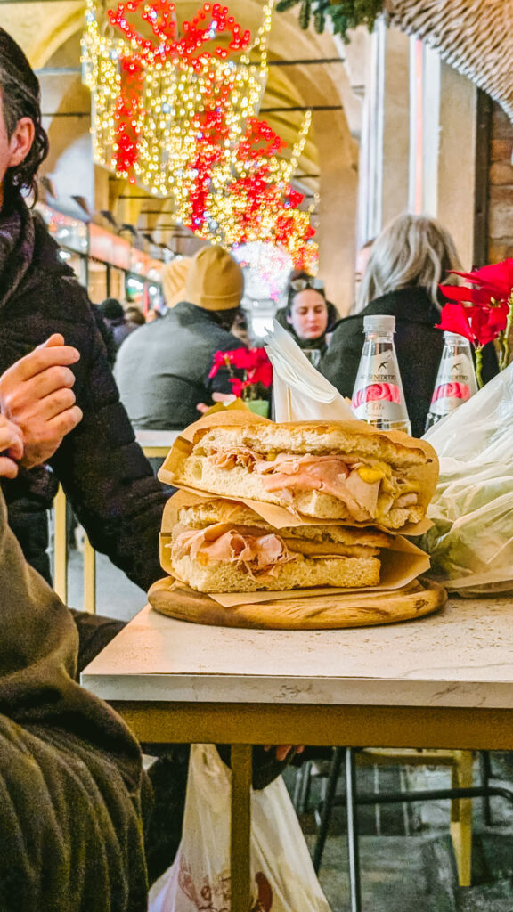 In the market around the Palazzo della Ragione, one of the simplest and most satisfying things you can find is a mortadella sandwich, warm, soft, and deeply local. Head to one of the small panini stalls tucked under the arcades or just beside the main market entrances in Piazza delle Erbe. These vendors serve sandwiches straight from fresh rolls, sliced open and packed with thick cuts of mortadella, sometimes with a smear of mustard or a piece of cheese, but often left plain to let the meat speak for itself. Pair it with a hot drink from a nearby booth, usually either mulled wine, apple punch, or a strong espresso served in a small paper cup. You can eat it standing up, leaning on one of the old stone walls, watching people pass through the winter crowd. It’s not fancy, but it’s one of those small, everyday pleasures that feels perfectly right in the middle of a cold December market in Padua.
