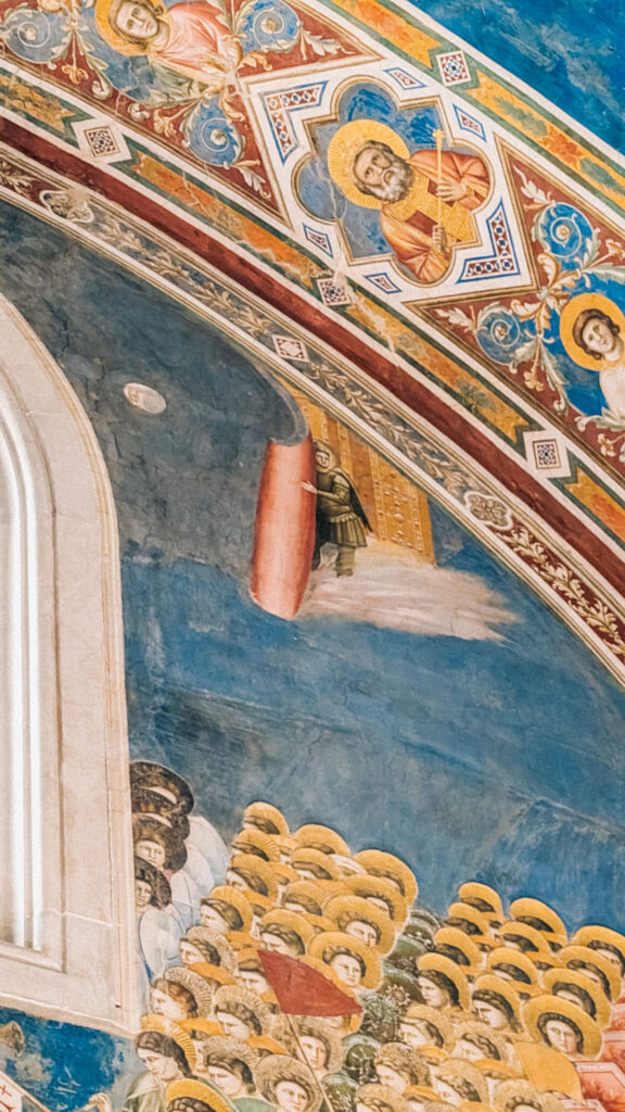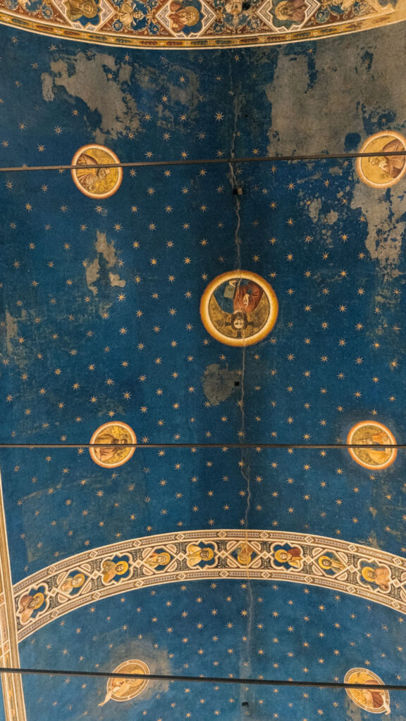 Stepping inside, the first thing you notice is the ceiling. It’s painted deep blue, like dusk, and filled with golden stars. The effect is both cosmic and intimate. Along the walls, each panel is framed like a page in a book, leading you through the sequence of events. Giotto’s figures feel grounded and human. Their faces are expressive. They hold real emotion, sorrow, joy, hesitation, and that gives the space a quiet weight.