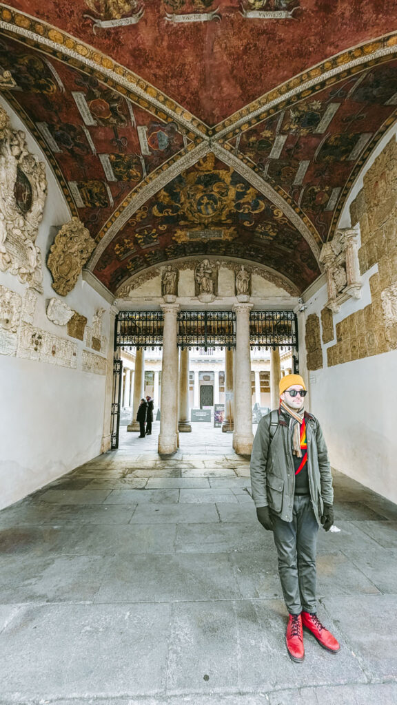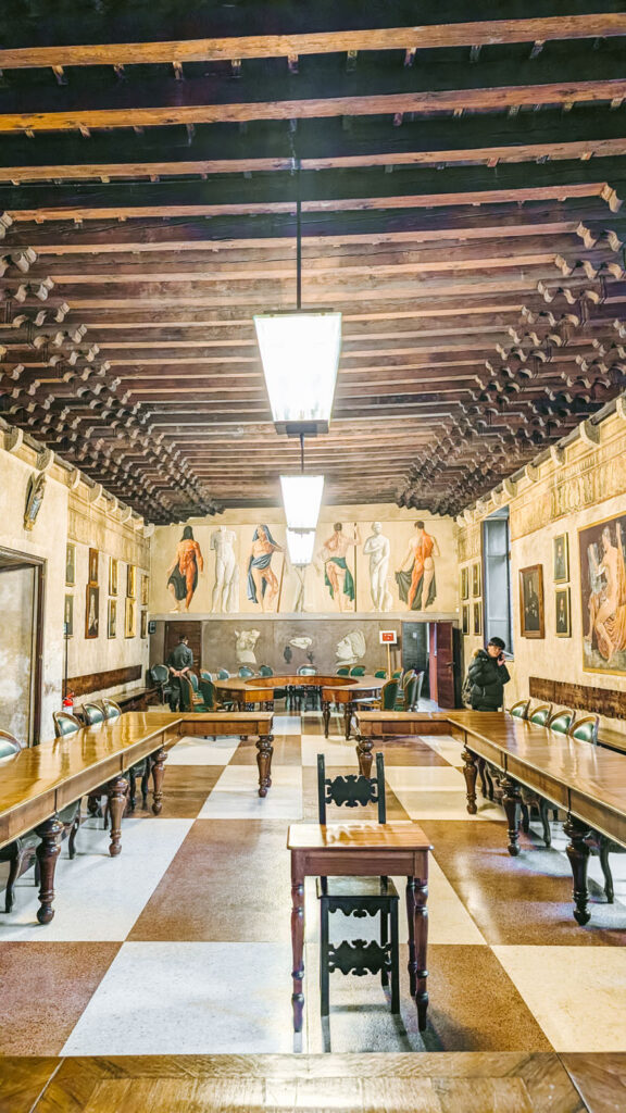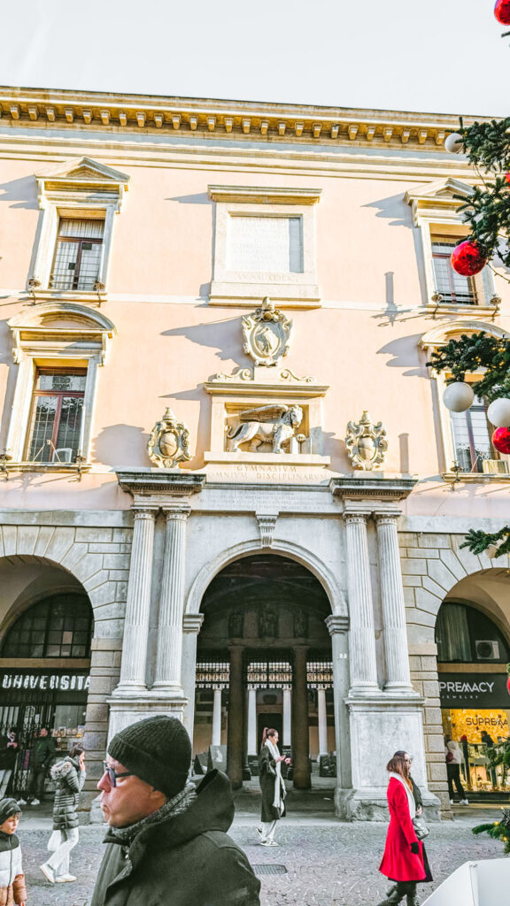 After lunch and exploring the Christmas Market, you might need to warm up a little bit, so it’s time to head inside and visit the University of Padua. On your way there, stop just outside the Palazzo Moroni, Padua’s historic city hall. Built in the 16th century and expanded over time, it has long been the seat of the city’s municipal government. Architecturally, it’s an elegant building with a mix of Renaissance and later influences, known for its arched windows, classical lines, and stone balconies.
