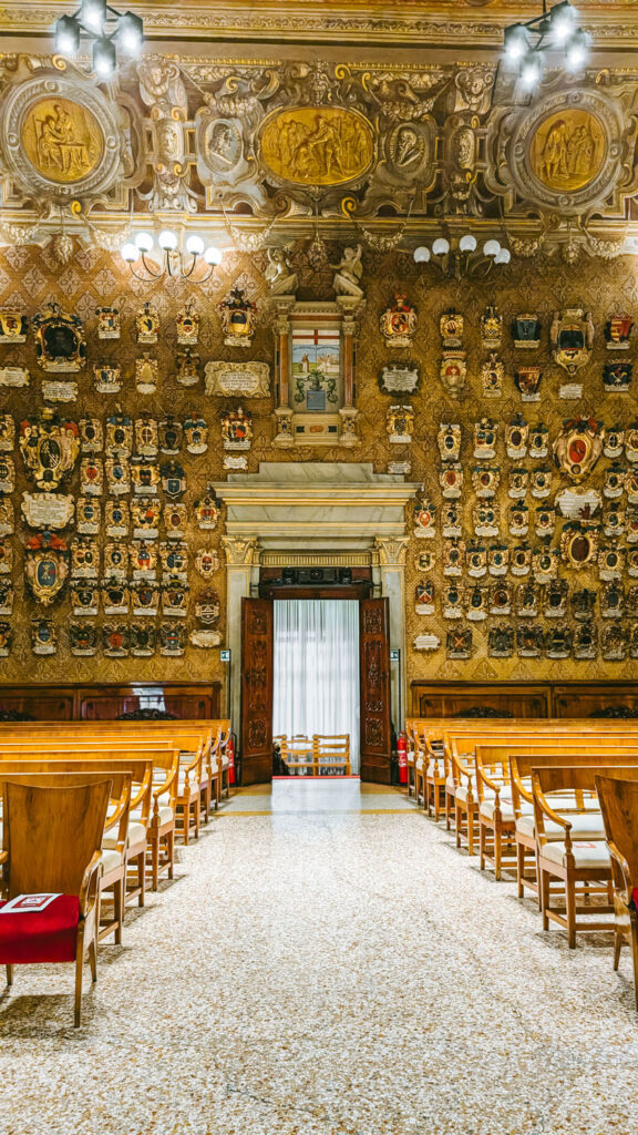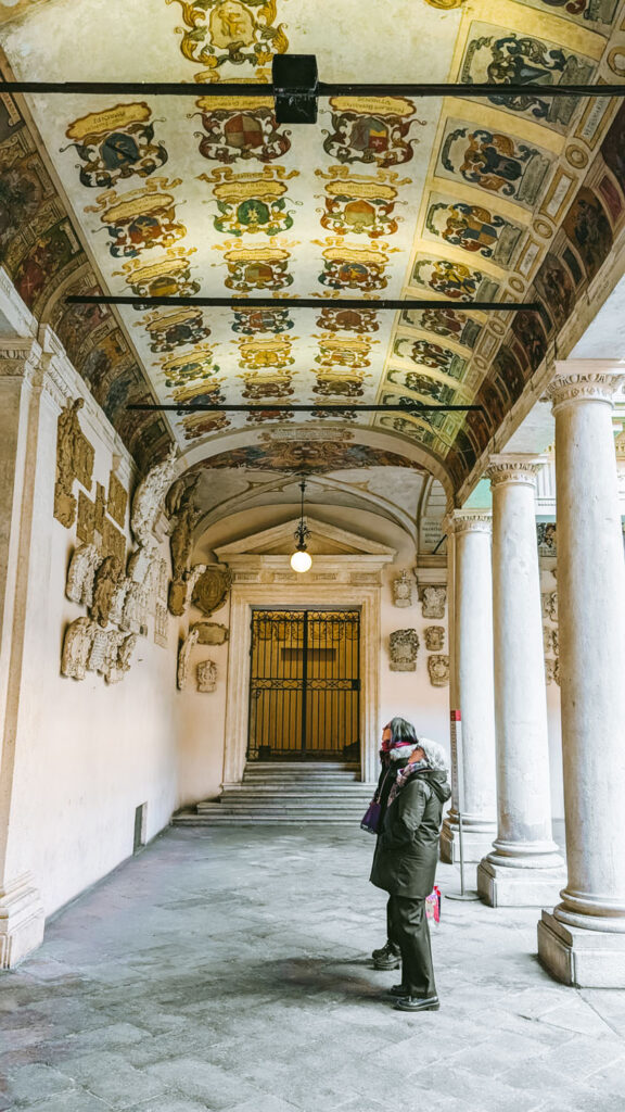 Walking into the courtyard of the University building, you’ll be struck by the hundreds of coats of arms displayed on the outside (and inside) of the Palazzo del Bo. These serve as a visual record of the university’s long academic legacy. Each one represents a student who served as rector, a leading student official, during their time at the university. The tradition began in the 15th century, and over time, these symbols formed a kind of public archive of Padua’s diverse student body. Many of the coats of arms include place names, showing that students came from across Italy and Europe to study in Padua. In a time when universities were few and travel was difficult, this diversity reflected the university’s reputation as a centre for serious, independent learning.