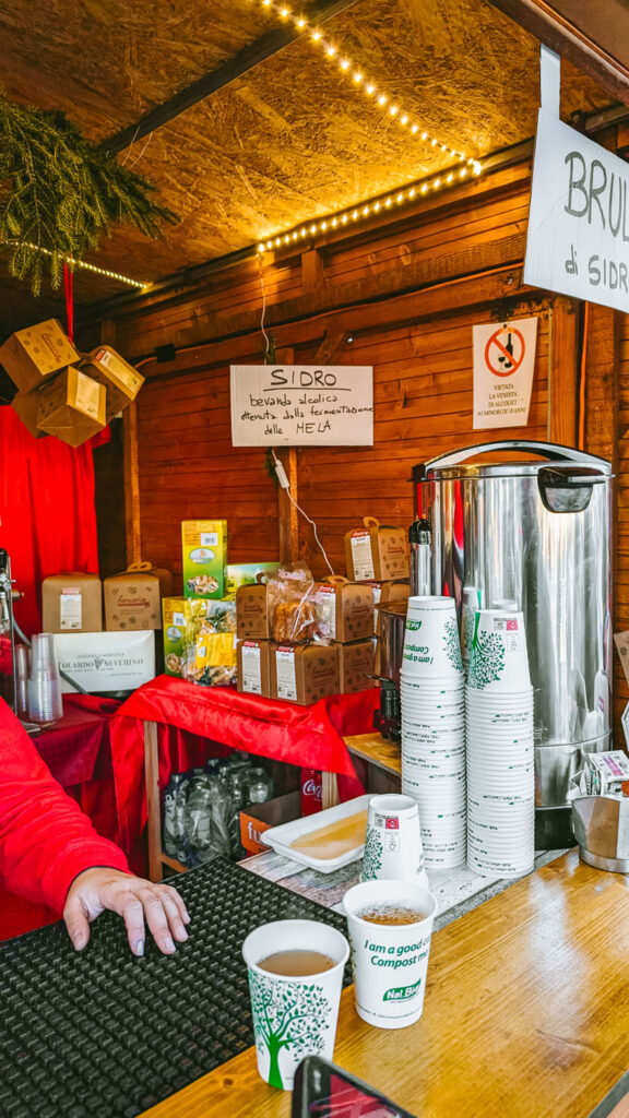 Rows of wooden stalls offered handmade scarves, wool hats, silver jewellery, and small leather goods. One stand sold glass ornaments shaped like stars and animals. Another had jars of chestnut honey and dried orange slices. I warmed my hands on a cup of mulled wine and took in the smells of cinnamon, roast nuts and cold pine. They also serve apple punch (both spiked and alcohol-free) which is a unique winter offering I only saw in Padua!