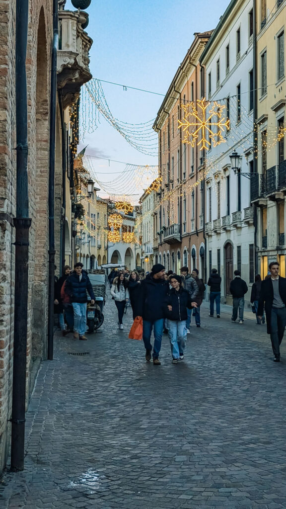Walking down Via Roma and Umberto I at Christmas feels like moving through a ribbon of light and quiet celebration. The street itself is one of Padua’s main shopping avenues, but in December it becomes part of the city’s holiday scene. Strings of warm white lights stretch above the road, framed by the stone buildings and shop fronts, so everything feels gently illuminated rather than bright or overwhelming.