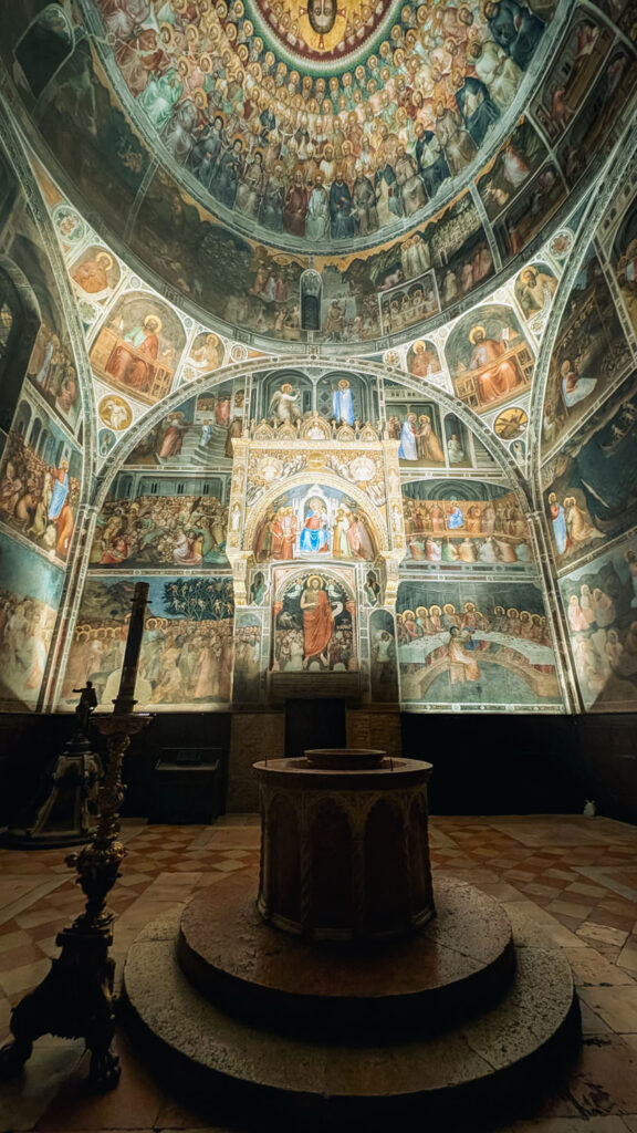 If you still have time before the day winds down, it’s well worth stepping inside the Battistero di San Giovanni, right next to the Duomo. From the outside, it’s a quiet, round Romanesque structure, easy to pass without much notice. But inside, it holds one of Padua’s most remarkable treasures.