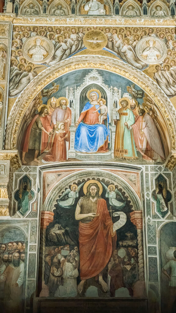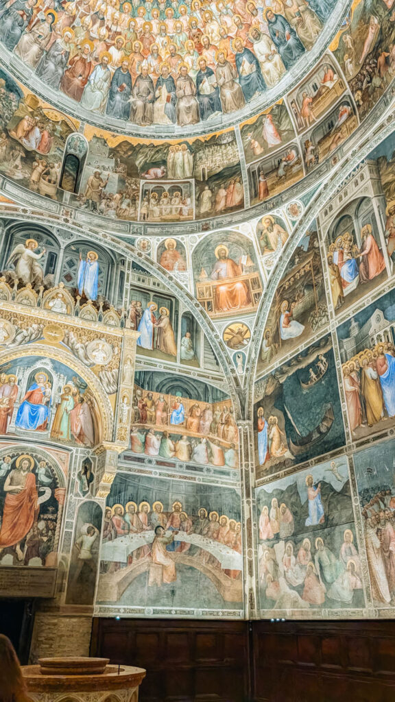 Inside, the fresco cycle by Giusto de’ Menabuoi is nothing short of extraordinary. Commissioned by Fina Buzzaccarini, the wife of Francesco da Carrara (Padua’s ruling lord at the time), the paintings reflect both religious devotion and civic pride. Giusto’s work filled every inch of wall and ceiling with narrative, theology, and celestial symbolism. It was designed to impress, to educate, and to awe, and even centuries later, it still does.