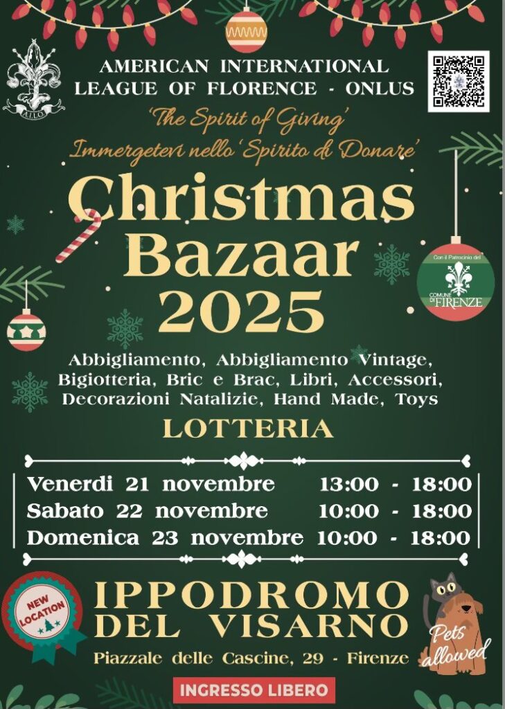 From November 21 to 23, 2025, the grand glasshouse in Florence’s Giardino dell’Orticultura, the majestic Tepidarium, sets the stage for the city’s longest-running holiday fair: the Christmas Bazaar. Now celebrating its 49th edition, this cherished event is organized by AILO (The American International League of Florence ODV) with the support of the city. It brings together a warm and joyful community of women from around the world, all united by one mission: giving back.